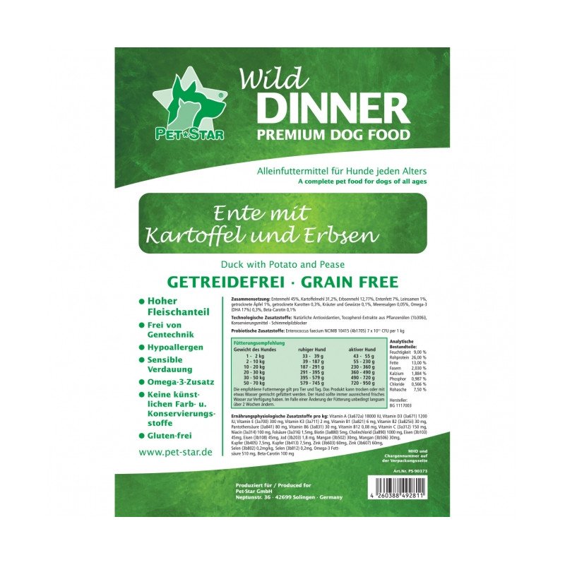 Zusammensetzung: Entenmehl 45%, Kartoffelmehl 31,2%, Erbsenmehl 12,77%, Entenfett 7%, Linsensamen 1%, getrocknete Äpfel 1%, getrocknete Karotten 0,3%, Kräuter und Gewürze 0,1%, Meeresalgen 0,05%, Omega-3 (DHA 17%) 0,3%, Beta-Carotin 0,1%