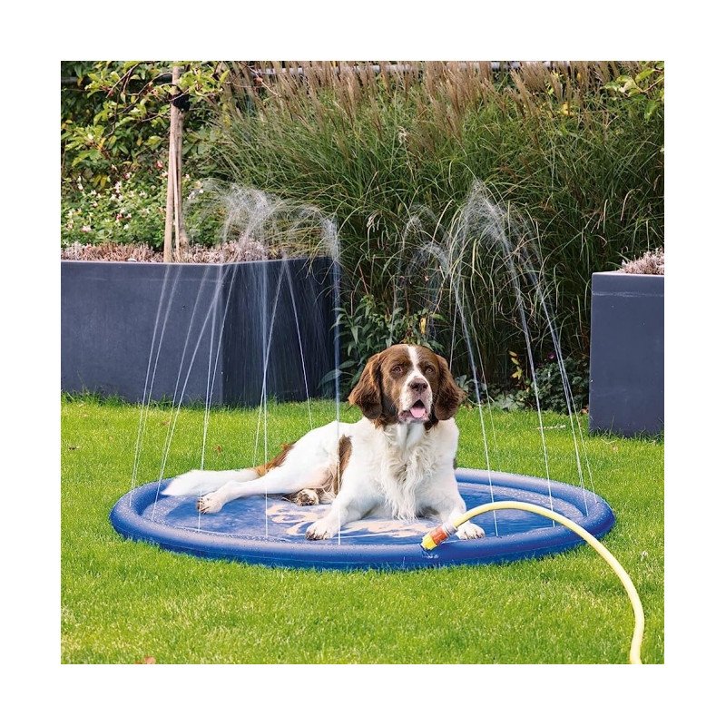 Die Sprinklermatte verschafft Hunden an heißen Tagen eine angenehme Abkühlung. Die robuste Matte ist am Rand mit verschiedenen kleinen Öffnungen ausgestattet, aus denen Wasser spritzt, sobald die Matte mithilfe des mitgelieferten Verbindungsstücks an einen Wasserschlauch angeschlossen wird. Der Hund braucht sich also nur auf auf die Matte legen und kann die kühlenden Wasserstrahlen genießen.