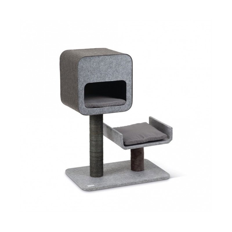 Dank der Materialwahl und der puristischen Farbgebung in Grautönen ist der Kratzbaum ein zeitlos schönes Möbel, das sich vielen Einrichtungsstilen anpasst. Vom Liegeplatz aus kann die Katze alles im Auge behalten, dort lässt sich aber auch gut ein kleines Nickerchen halten. Und natürlich lädt besonders das Katzenhaus nach einer ausgiebigen Kratzsession zum entspannten Verweilen ein.