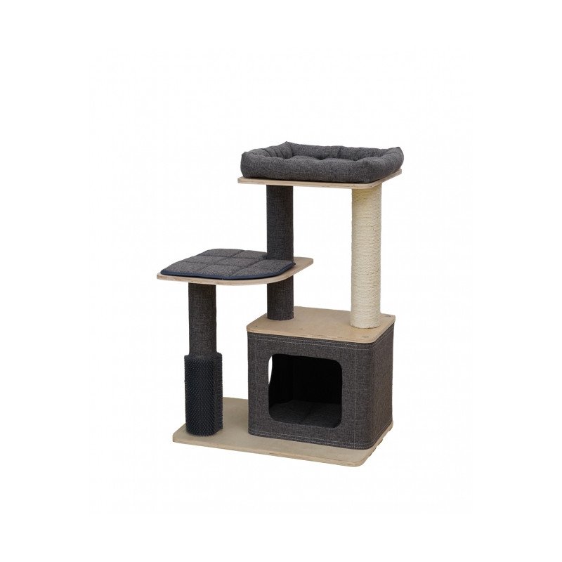 Er verfügt über robuste Kratzstämme, die mit starkem Sisal umwickelt sind. Außerdem verfügt Tapei über ein Katzenhaus mit zwei Öffnungen, das sich hervorragend als Versteck und Ruheplatz für Ihre Katze eignet! Der bequeme Korb auf der Oberseite kann sowohl als Sicht- als auch als Schlafplatz dienen. Einer der Pfosten ist mit einer Massgebürste ausgestattet.