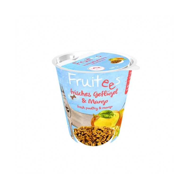 FRUITEES mit Mango sind getreidefreie, saftige Mini Knochen mit min. 20 % Frischfleisch aus Geflügel zur gesunden Belohnung und Training Ihres Hundes zu jeder Gelegenheit. Die Mango enthält wertvolle
