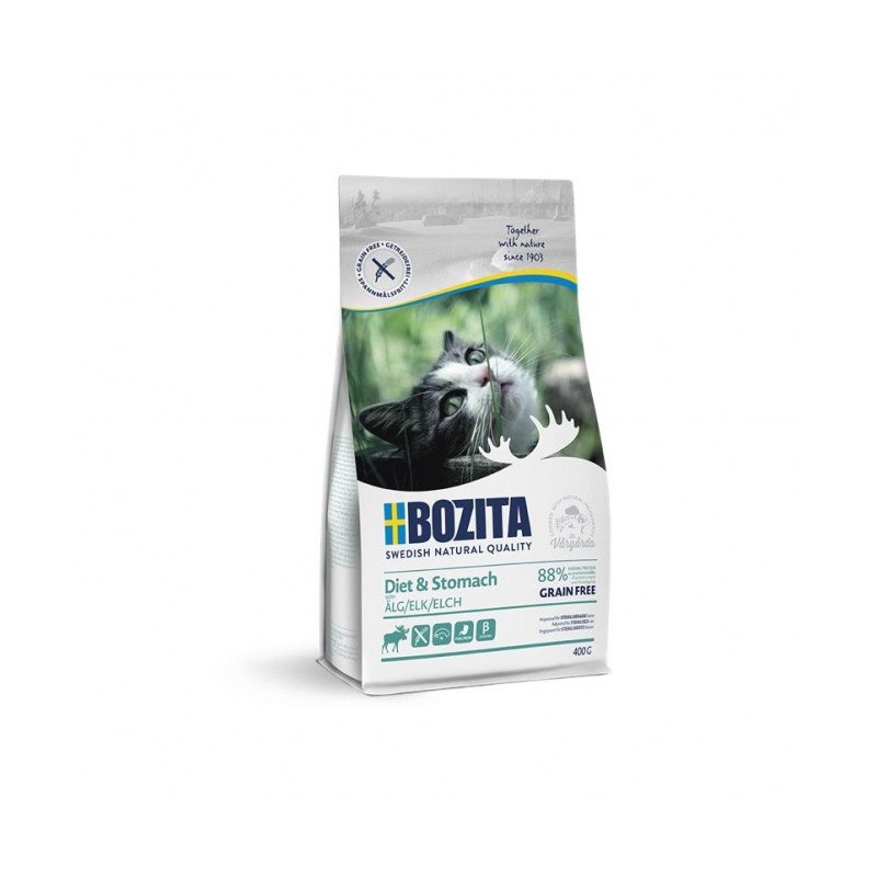 Bozita Diet & Stomach Getreidefrei Elch ist ein Alleinfuttermittel für die erwachsene Katze. Dank des niedrigen Energieniveaus und des geringen Fettgehalts von nur 10 % ist das Futter speziell für die weniger aktive oder übergewichtige Katze geeignet. Frisch zubereiteter Elch ist sehr schmackhaft und bekömmlich und eignet sich selbst für die wählerischste Katze. Mit seinem niedrigem Fettgehalt, Elch als einzigartiger Proteinquelle und mit präbiotischem FOS und MOS ist dieses Futter besonders für Katzen mit einem empfindlichen Magen geeignet. Das Futter enthält L-Carnitin, das ein wesentlicher Bestandteil des Stoffwechsels der Katze ist. Das Produkt enthält außerdem natürliche Beta-Glucane aus Hefe mit gesundheitsfördernden Eigenschaften, ein optimales Gleichgewicht an Mineralstoffen (Ca, P, Mg) und einen hohen Anteil an Vitaminen und Taurin.