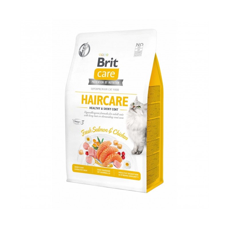 Super Premium Trockennahrung für erwachsene Katzen ab 12 Monate mit langem Haar und anspruchsvoller Fellpflege. Hypoallergene und getreidefreie Rezeptur. Reich an frischem Lachs, leckerem Hühnerfleisch & Omega Fettsäuren. Für ein glänzendes Fell und eine gesunde Haut.