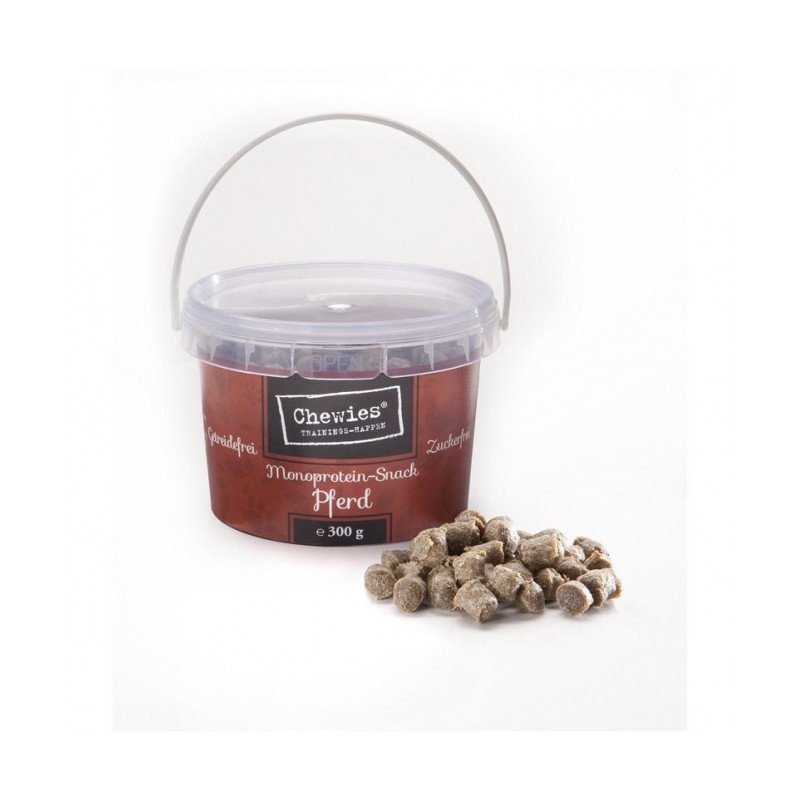Unsere Chewies Trainings-Happen Pferd sind ein äußerst schmackhafter Belohnungssnack für ernährungsensible oder Allergie geplagte Hunde. Pferd ist die einzige tierische Proteinquelle, die mit Kartoffeln, Möhren, Äpfeln, vielen Kräutern, Ölen und Mineralstoffen zusammen zu einem unvergleichlich leckeren Happen verarbeitet wird. Füttern Sie Gesundheit! Chewies Trainings-Happen sind sehr bekömmlich, hochverdaulich und eine köstliche Belohnung für Ihren Hund! Chewies - 100 % Hund!