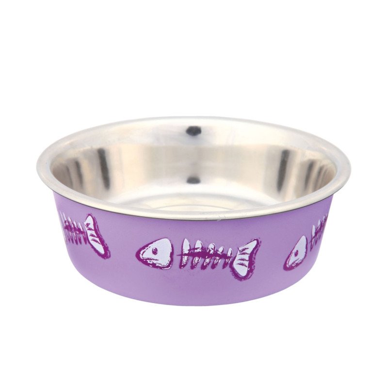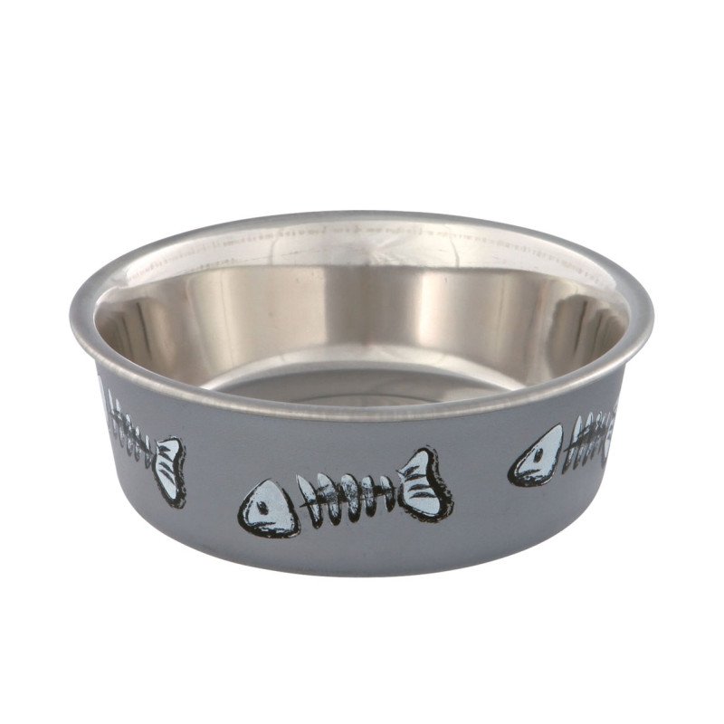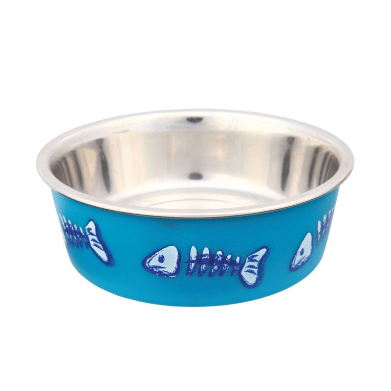 Der Katzennapf aus rostfreiem Edelstahl ist mit einem Kunststoffmantel mit Fischmotiven bestückt. Ein dicker Gummiring an der Unterseite des Napfes macht ihn standsicher und rutschfest.