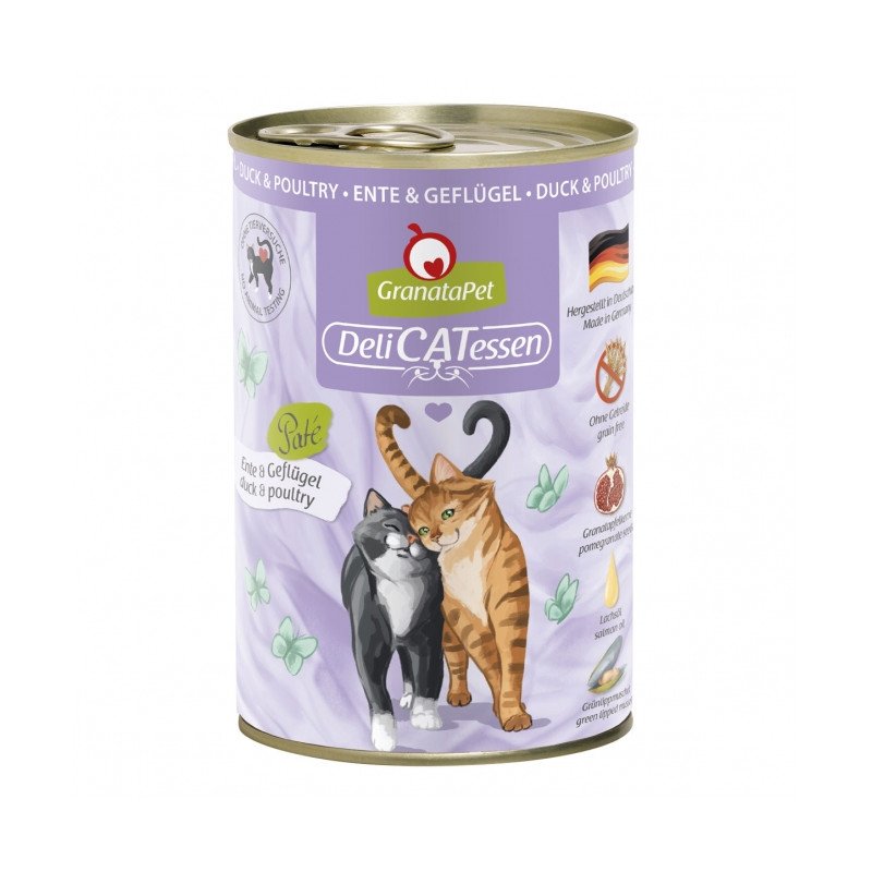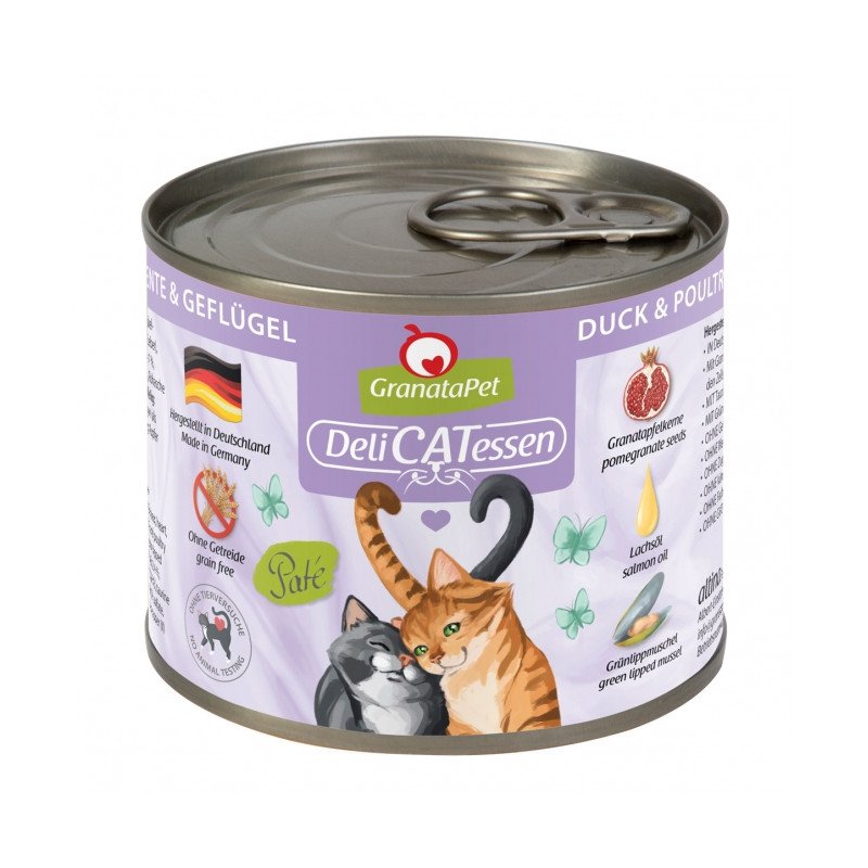 Zusammensetzung: Enten- und Geflügelfleisch 72 % (Ente 36 % bestehend aus Muskelfleisch, Herz, Magen und Geflügel 36 % bestehend aus Muskelfleisch, Herz, Magen, Leber), Enten- und Geflügelbrühe 24,9 %, Granatapfelkerne 1 %, Lachsöl 1 %, Mineralstoffe 1 %, Grünlippmuschel 0,1 %