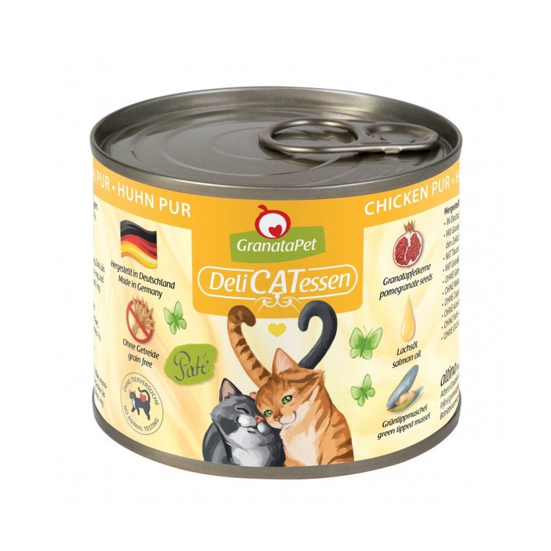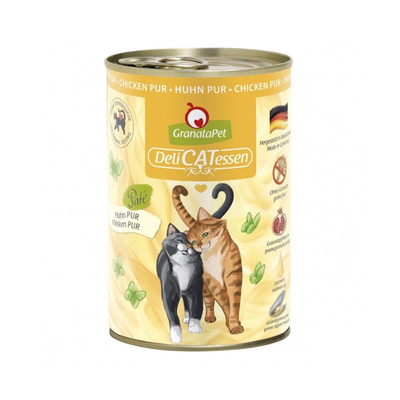 Zusammensetzung: Hühnerfleisch 72 % (bestehend aus Muskelfleisch, Herz, Magen, Leber), Hühnerbrühe 24,9 %, Granatapfelkerne 1 %, Lachsöl 1 %, Mineralstoffe 1 %, Grün¬lippmuschel 0,1 %