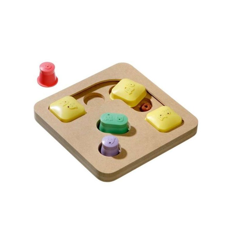 Für Fortgeschrittene! Doggy Brain Train Motion - ein Motivations- und Denkspiel für Hunde. Snacks werden in Vertiefungen gelegt, welche dann von Hütchen abgedeckt werden. Durch Schieben mit Pfote oder Schnauze oder durch Anheben der Hütchen kommt der Hund an sein Leckerlie. Dieses Spiel kann in verschiedenen Schwierigkeitsstufen gespielt werden, z. B. indem der Hund erst ein Hütchen heben und dann ein weiteres Hütchen schieben muss, um sein Leckerlie zu erhalten. Die Cups sind in verschiedenen Farben und Formen und jeweils mit Duftlöchern. Mit Anti-Rutsch-Stopper.