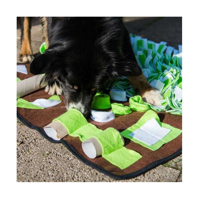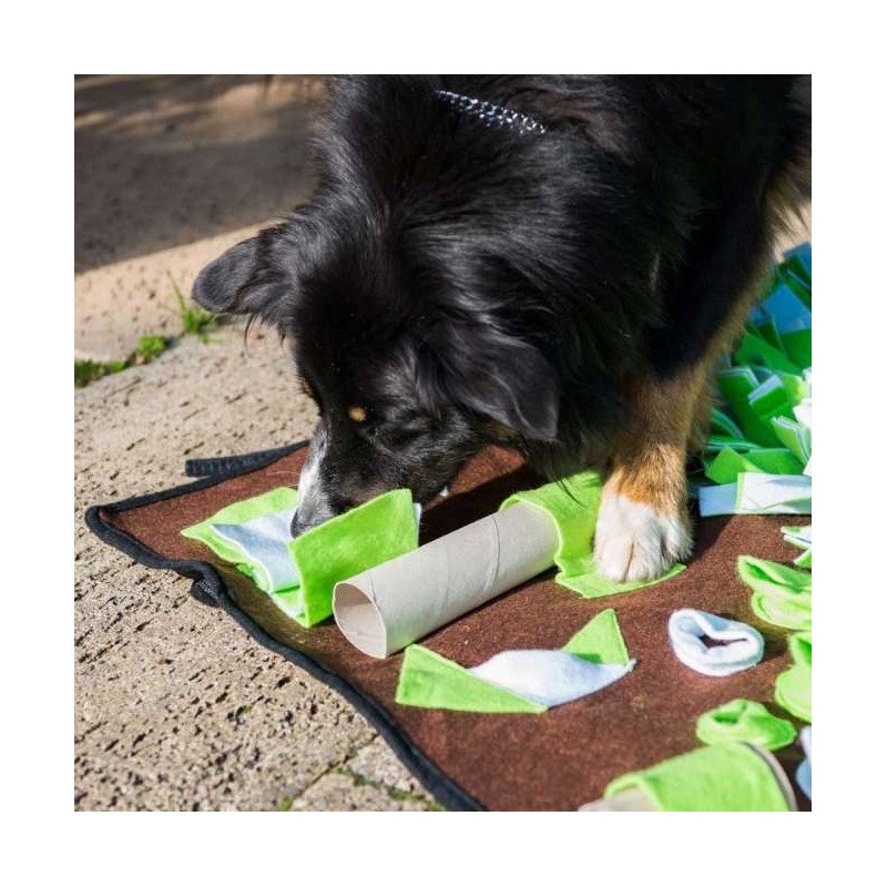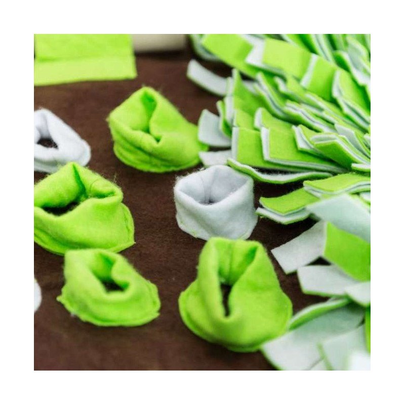 Die Intelligenzschnüffelmatte ist 80 x80cm groß und besteht zur Hälfte aus einer Schnüffelwiese. Die andere Hälfte besteht aus über 20 Leckerli-Versteckmöglichkeiten in sieben verschiedenen Variationen und bietet Ihrem Vierbeiner jede Menge Beschäftigung, Herausforderung und Spaß.