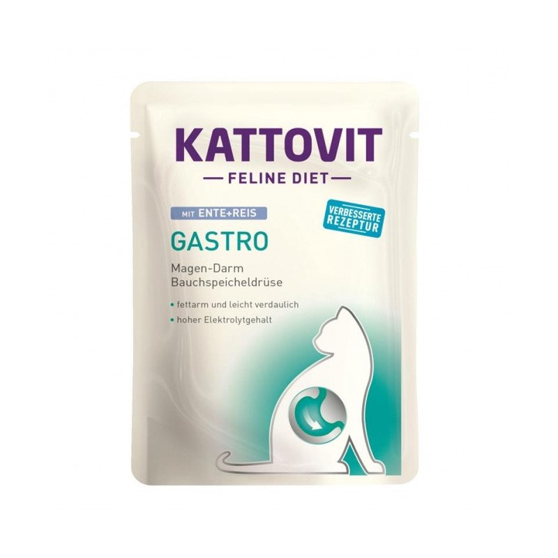Kattovit Feline Diet Gastro - Magen-Darm / Bauchspeicheldrüse (i-Rezeptur) 85g-Pouch fettarm und leicht verdaulich, hoher Elektrolytgehalt. Zum Ausgleich unzureichender Verdauung und exokriner Pankreasinsuffizienz sowie zur Linderung akuter Resorptionsstörungen des Darms. Kattovit Feline Diet - Gastro wurde speziell für Katzen mit gastro-intestinalen Problemen (Magen-Darm, Bauchspeicheldrüse) entwickelt. Dieses Diätfuttermittel hat einen niedrigen Fettgehalt in einer besonders leicht verdaulichen Zusammensetzung sowie einen erhöhten Elektrolytgehalt.