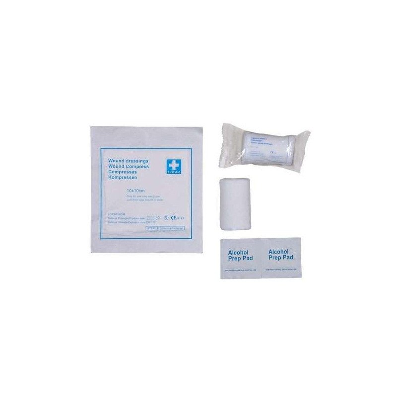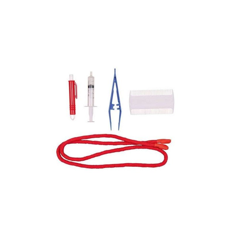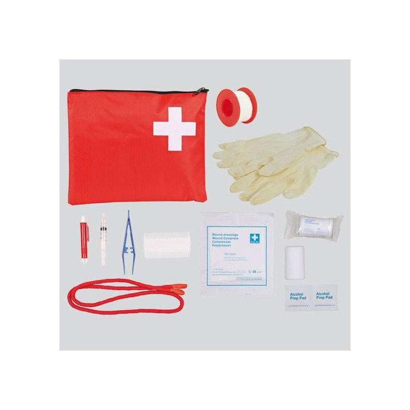 In der Tasche befinden sich: - 1 Wundkompresse, steril - 1 Verbandpäckchen, steril - 1 Fixierbinde, steril - 1 Heftpflasterspule - 2 Alkoholtupfer - 1 Einwegspritze, 20 ml - 1 Pinzette - 1 Paar Latexhandschuhe - 1 Maulschlaufe - 1 Floh- und Läusekamm - 1 Zeckenzange - inklusive Buch mit wertvollen Tipps zur richtigen Erstversorgung