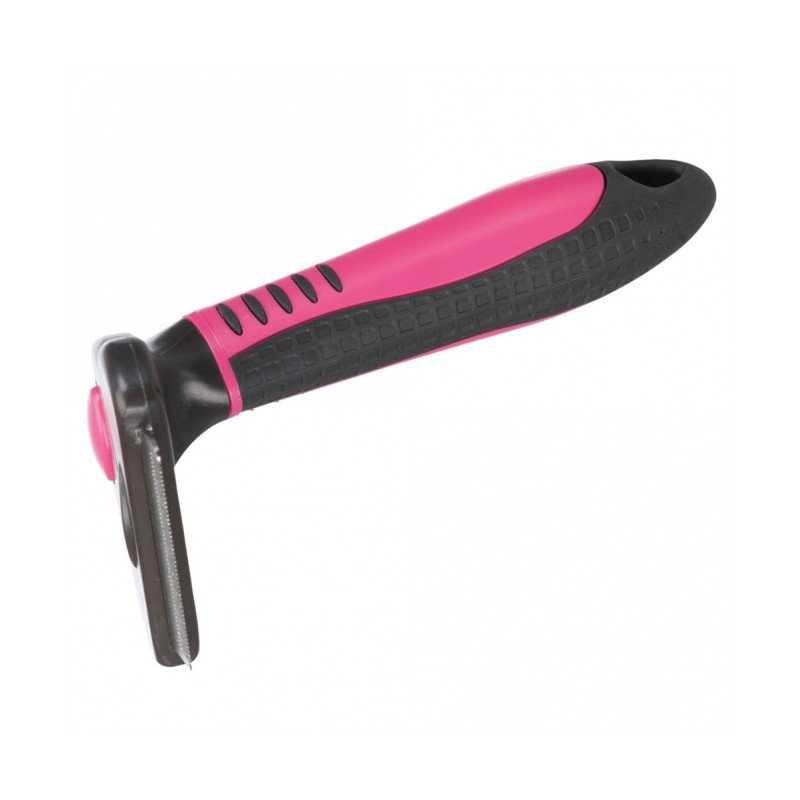 Der Striegelkopf lässt sich durch einen Schnappmechanismus am Griff einfach austauschen. Die Klinge ist aus rostfreiem Edelstahl.