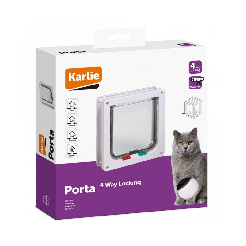 Die Karlie Katzentüren Porta erleichtern das Leben von Freigänger-Katzen und ihren Besitzern. Sie bestehen aus einem Rahmen, einem Scharniersowie einer horizontal befestigten Klappe. Letztgenannte wird vom Tiermit dem Kopf nach vorn geschoben, um dann durch die Öffnung zu gelangen. So kann die Katze selbständig und sicher zwischen Haus und Außenbereich wechseln. Ein Magnetverschluss und eine Bürstendichtung machen dieKatzentür wetterfest und zugluftsicher. Dank des Verschlusssystems kannzudem gesteuert werden, ob die Katze beliebig hinaus- und hineingehenkann oder ob die Nutzung eingeschränkt wird. Die mechanische Katzentürmit 4-Wege-Verschluss bietet die Wahl zwischen geöffnet (hinaus undhinein) und geschlossen sowie den Optionen nur hinein und nur hinaus.