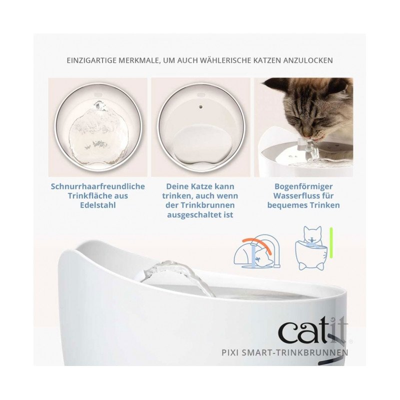 Der Trinkbrunnen verfügt über einen Düsenkopf, der einen bogenförmigen Wasserfluss erzeugt, wenn er aufgesetzt wird. Endlich kann deine Katze bequem trinken, ohne eine komische Haltung einnehmen zu müssen!
