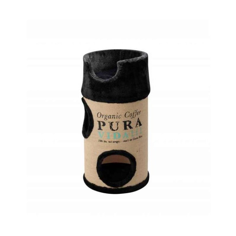 Diese Kratztonne ist komplett mit robustem Jute-Stoff verklebt. Sie ist mit zwei Höhleneingängen, zwei mit Plüsch besetzten Ebenen und einem gepolsterten Bett auf der Oberseite der Tonne ausgestattet.