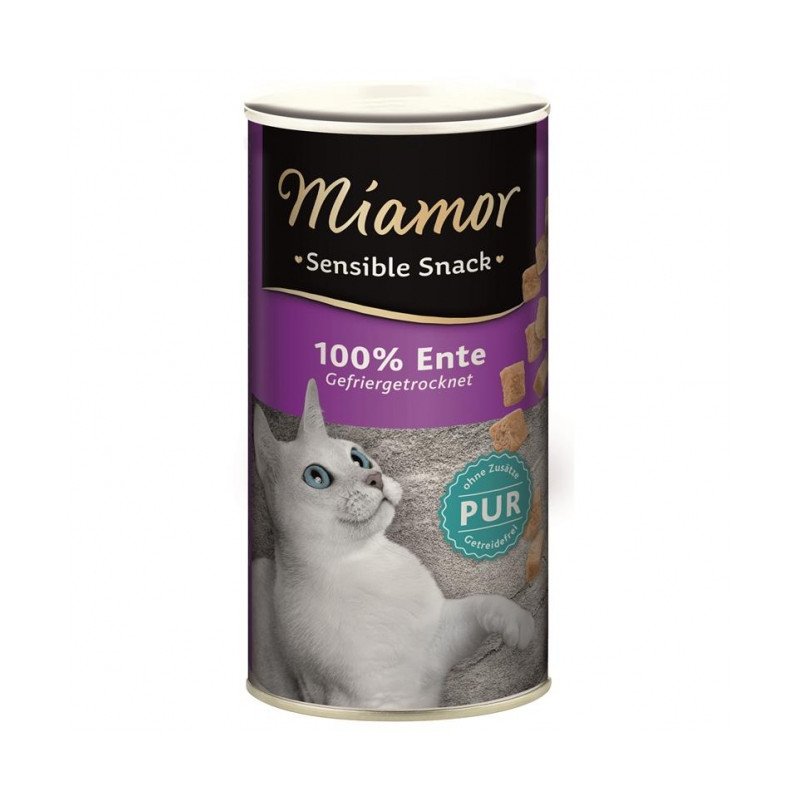 100% Ente Pur- auch für empfindliche Katzen. Miamor Sensible Snacks werden in einem aufwendigen Produktionsprozess vakuum-gefriergetrocknet mit anschließender Sterilisation. Bei diesem besonderen Trocknungsprozess bleibt der volle Fleischgeschmack erhalten und es kann auf jegliche Zusätze verzichtet werden. Deshalb ist Miamor Sensible Snack nicht nur unwiderstehlich, sondern auch als reines PUR-Produkt für ernährungssensible Katzen ideal. Nach dem Anbruch bitte kühl und trocken lagern und innerhalb von zwei Wochen aufbrauchen.