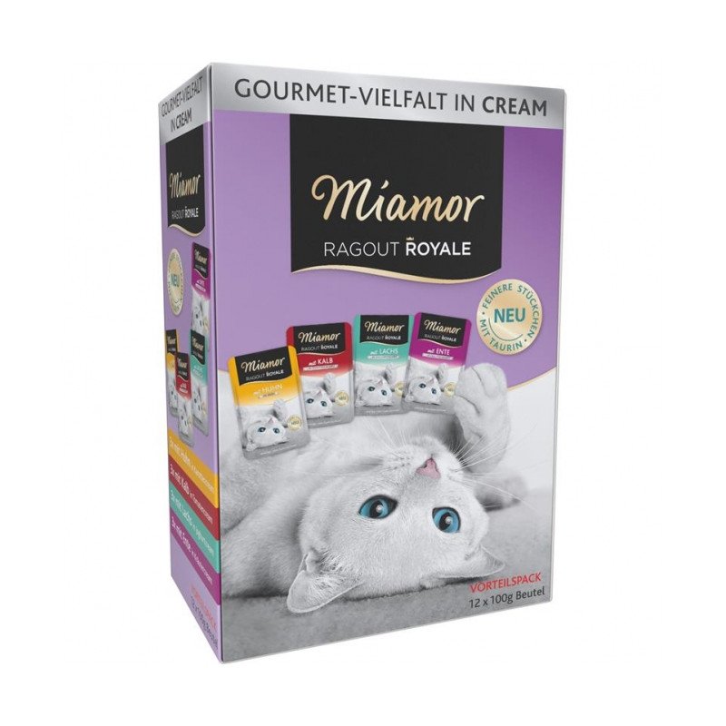 Miamor Ragout Royale in Cream - Cream Vielfalt Multibox - Ragout-Stückchen in delikater Cream. Zarte Stückchen in Cream zubereitet, ein königlicher Genuss. Vitamin-Schonverfahren. Ohne Farb- und Konservierungsstoffe. In den vier Geschmacksrichtungen: Lachs in Joghurtcream, Kalb in Tomatencream, Ente in Kräutercream, Huhn in Karottencream.