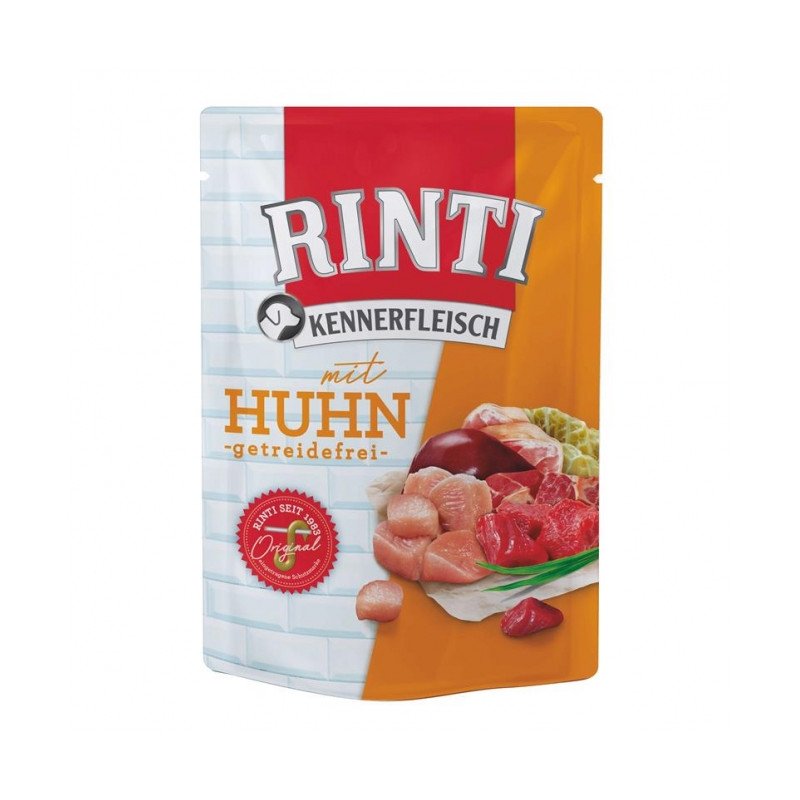 Stücke zeichnen das echte RINTI Kennerfleisch aus. Wie alle RINTI Nassfutter ist natürlich auch RINTI Kennerfleisch mit Huhn frei von