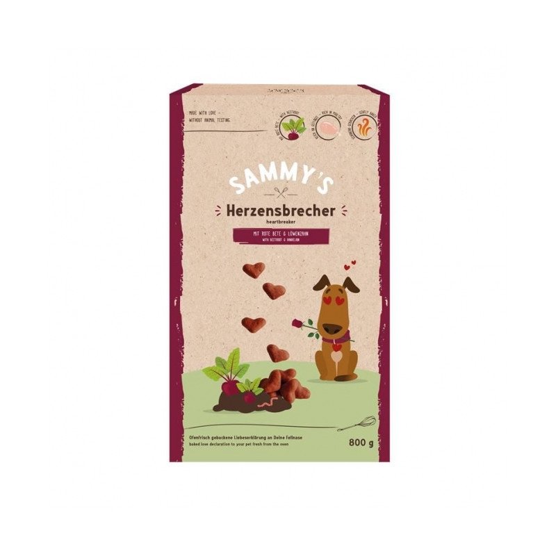 Der Grundteig von Sammy's fein gebackenen, kleinen Herzen wird in unserer hauseigenen Backstube liebevoll zubereitet. Erlesene Rote Bete und getrockneter Löwenzahn stehen in perfekter Harmonie zueinander und runden die Basis aus Weizen wunderbar ab.
