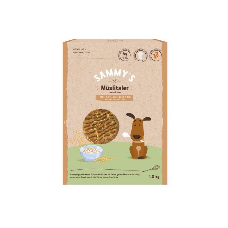 Knackiges Vollkorn, vollmundiger Mais, kräftiges Weizen- und Dinkelmehl und zarte Haferflocken sind Sammy's Zutaten für seinen Müslitaler. Die hochwertige 5-Korn-Mischung wird in alter Backtradition behutsam verknetet und schonend im Ofen gebacken. Unverwechselbar mit der goldbraunen Kruste ist unser 5-Korn-Müslitaler besonders hart und knusprig, damit Deine große Fellnase auch morgen noch kraftvoll zubeißen kann.