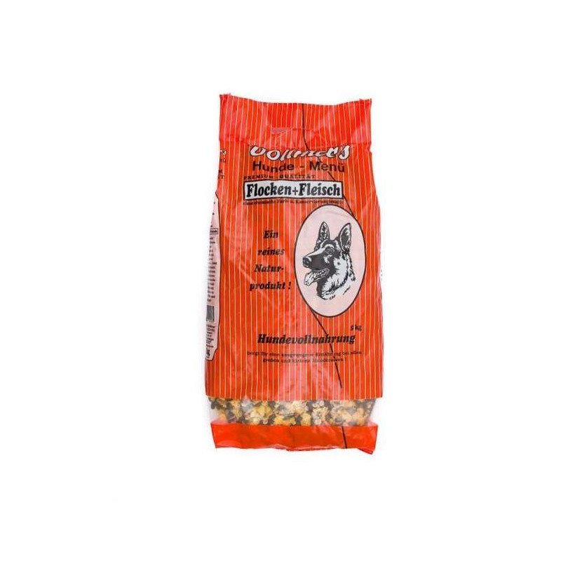 Vollmers Flocken & Fleisch ist eine vollwertige Fleisch-Flocken-Vollnahrung aus verschiedenen gekochten, hochverdaulichen Vollkornflocken, Erbsenflocken, Gemüse und Fleisch. Die erkennbaren, getrockneten Fleischstückchen stammen von normal geschlachteten Tieren aus heimischen Beständen, die für die menschliche Ernährung freigegeben sind (nicht von verendeten Tieren).