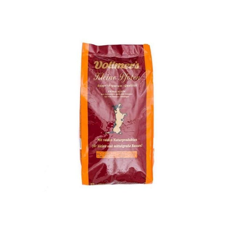 Vollmers Kleine Pfoten ist eine ausgewogene Vollnahrung speziell für kleine und mittelgroße Hunderassen. Die kleinere Bröckchengröße ist den Verzehrgewohnheiten kleiner Hunde angepasst.