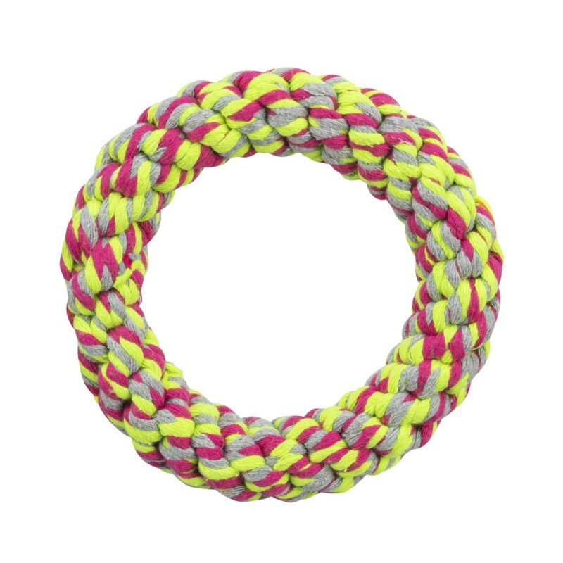 Der Tau-Ring besteht aus reiner Baumwolle und reinigt und pflegt spielend das Gebiss Ihres Hundes.